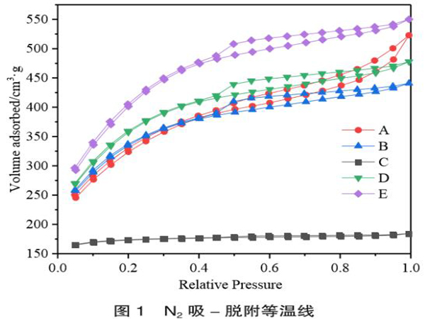 椰壳活性炭的氮气吸脱附分离曲线见图1所示。5种椰壳活性炭的吸附类型均为I型。I型等温线反映了椰壳活性炭含有大量的微孔结构,吸附过程中发生了微孔填充现象,饱和吸附值等于微孔的填充体积。